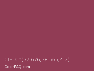 CIELCh 37.676,38.565,4.7 Color is a normal rose color and the nearest color is Quinacridone Magenta #8e3a59. Hex code #913c55 and RGB value is rgb(145,60,85). In RGB color space, this color is composed of 57% red, 24% green, 33% blue, In CMYK color space, this color is composed of 0% cyan, 59% magenta, 41% yellow , 43% black , In HSL color space, this color has a hue angle of 342° , 41% saturation and 40% lightness.