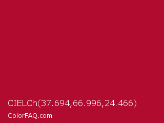 CIELCh 37.694,66.996,24.466 Color is a normal red color and the nearest color is Shiraz #b20931. Hex code #b20b30 and RGB value is rgb(178,11,48). In RGB color space, this color is composed of 70% red, 4% green, 19% blue, In CMYK color space, this color is composed of 0% cyan, 94% magenta, 73% yellow , 30% black , In HSL color space, this color has a hue angle of 347° , 88% saturation and 37% lightness.