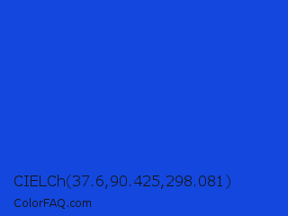 CIELCh 37.6,90.425,298.081 Color is a normal blue color and the nearest color is Palatinate Blue #273be2. Hex code #1347dd and RGB value is rgb(19,71,221). In RGB color space, this color is composed of 7% red, 28% green, 87% blue, In CMYK color space, this color is composed of 91% cyan, 68% magenta, 0% yellow , 13% black , In HSL color space, this color has a hue angle of 225° , 84% saturation and 47% lightness.