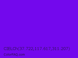 CIELCh 37.722,117.617,311.207 Color is a normal violet color and the nearest color is Electric Indigo #6f00ff. Hex code #7308ed and RGB value is rgb(115,8,237). In RGB color space, this color is composed of 45% red, 3% green, 93% blue, In CMYK color space, this color is composed of 51% cyan, 97% magenta, 0% yellow , 7% black , In HSL color space, this color has a hue angle of 268° , 93% saturation and 48% lightness.