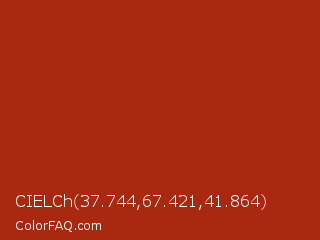 CIELCh 37.744,67.421,41.864 Color is a normal red color and the nearest color is Tabasco #a02712. Hex code #a8290f and RGB value is rgb(168,41,15). In RGB color space, this color is composed of 66% red, 16% green, 6% blue, In CMYK color space, this color is composed of 0% cyan, 76% magenta, 91% yellow , 34% black , In HSL color space, this color has a hue angle of 10° , 84% saturation and 36% lightness.
