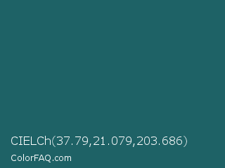 CIELCh 37.79,21.079,203.686 Color is a dark cyan color and the nearest color is Casal #2f6168. Hex code #1e6266 and RGB value is rgb(30,98,102). In RGB color space, this color is composed of 12% red, 38% green, 40% blue, In CMYK color space, this color is composed of 71% cyan, 4% magenta, 0% yellow , 60% black , In HSL color space, this color has a hue angle of 183° , 55% saturation and 26% lightness.