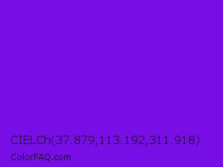 CIELCh 37.879,113.192,311.918 Color is a normal violet color and the nearest color is Violet Color Wheel #7f00ff. Hex code #780ee6 and RGB value is rgb(120,14,230). In RGB color space, this color is composed of 47% red, 5% green, 90% blue, In CMYK color space, this color is composed of 48% cyan, 94% magenta, 0% yellow , 10% black , In HSL color space, this color has a hue angle of 269° , 89% saturation and 48% lightness.