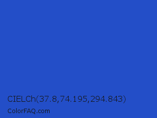 CIELCh 37.8,74.195,294.843 Color is a normal blue color and the nearest color is New Car #214fc6. Hex code #234ec8 and RGB value is rgb(35,78,200). In RGB color space, this color is composed of 14% red, 31% green, 78% blue, In CMYK color space, this color is composed of 83% cyan, 61% magenta, 0% yellow , 22% black , In HSL color space, this color has a hue angle of 224° , 70% saturation and 46% lightness.