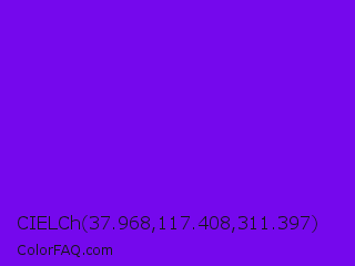 CIELCh 37.968,117.408,311.397 Color is a normal violet color and the nearest color is Electric Indigo #6f00ff. Hex code #7508ed and RGB value is rgb(117,8,237). In RGB color space, this color is composed of 46% red, 3% green, 93% blue, In CMYK color space, this color is composed of 51% cyan, 97% magenta, 0% yellow , 7% black , In HSL color space, this color has a hue angle of 269° , 93% saturation and 48% lightness.