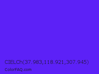 CIELCh 37.983,118.921,307.945 Color is a normal indigo color and the nearest color is Han Purple #5218fa. Hex code #5c21f7 and RGB value is rgb(92,33,247). In RGB color space, this color is composed of 36% red, 13% green, 97% blue, In CMYK color space, this color is composed of 63% cyan, 87% magenta, 0% yellow , 3% black , In HSL color space, this color has a hue angle of 257° , 93% saturation and 55% lightness.