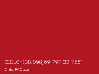 CIELCh 38.098,69.797,32.756 Color is a normal red color and the nearest color is Carnelian #b31b1b. Hex code #b21620 and RGB value is rgb(178,22,32). In RGB color space, this color is composed of 70% red, 9% green, 13% blue, In CMYK color space, this color is composed of 0% cyan, 88% magenta, 82% yellow , 30% black , In HSL color space, this color has a hue angle of 356° , 78% saturation and 39% lightness.