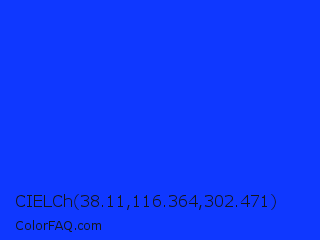 CIELCh 38.11,116.364,302.471 Color is a normal blue color and the nearest color is Blue RYB #0247fe. Hex code #0f38ff and RGB value is rgb(15,56,255). In RGB color space, this color is composed of 6% red, 22% green, 100% blue, In CMYK color space, this color is composed of 94% cyan, 78% magenta, 0% yellow , 0% black , In HSL color space, this color has a hue angle of 230° , 100% saturation and 53% lightness.