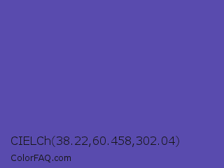 CIELCh 38.22,60.458,302.04 Color is a normal indigo color and the nearest color is Plump Purple #5946b2. Hex code #594bae and RGB value is rgb(89,75,174). In RGB color space, this color is composed of 35% red, 29% green, 68% blue, In CMYK color space, this color is composed of 49% cyan, 57% magenta, 0% yellow , 32% black , In HSL color space, this color has a hue angle of 248° , 40% saturation and 49% lightness.