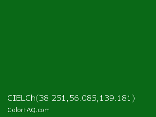 CIELCh 38.251,56.085,139.181 Color is a dark green color and the nearest color is Deep Green #056608. Hex code #0a6917 and RGB value is rgb(10,105,23). In RGB color space, this color is composed of 4% red, 41% green, 9% blue, In CMYK color space, this color is composed of 90% cyan, 0% magenta, 78% yellow , 59% black , In HSL color space, this color has a hue angle of 128° , 83% saturation and 23% lightness.