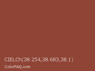 CIELCh 38.254,38.683,38.1 Color is a normal red color and the nearest color is Chestnut #954535. Hex code #8f4435 and RGB value is rgb(143,68,53). In RGB color space, this color is composed of 56% red, 27% green, 21% blue, In CMYK color space, this color is composed of 0% cyan, 52% magenta, 63% yellow , 44% black , In HSL color space, this color has a hue angle of 10° , 46% saturation and 38% lightness.