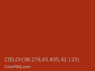 CIELCh 38.279,65.835,42.123 Color is a normal red color and the nearest color is Tabasco #a02712. Hex code #a82d12 and RGB value is rgb(168,45,18). In RGB color space, this color is composed of 66% red, 18% green, 7% blue, In CMYK color space, this color is composed of 0% cyan, 73% magenta, 89% yellow , 34% black , In HSL color space, this color has a hue angle of 11° , 81% saturation and 36% lightness.