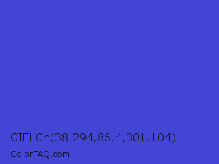 CIELCh 38.294,86.4,301.104 Color is a normal blue color and the nearest color is Iris #5a4fcf. Hex code #4345d5 and RGB value is rgb(67,69,213). In RGB color space, this color is composed of 26% red, 27% green, 84% blue, In CMYK color space, this color is composed of 69% cyan, 68% magenta, 0% yellow , 16% black , In HSL color space, this color has a hue angle of 239° , 63% saturation and 55% lightness.