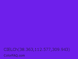 CIELCh 38.363,112.577,309.943 Color is a normal violet color and the nearest color is Blue Violet #8a2be2. Hex code #6e1feb and RGB value is rgb(110,31,235). In RGB color space, this color is composed of 43% red, 12% green, 92% blue, In CMYK color space, this color is composed of 53% cyan, 87% magenta, 0% yellow , 8% black , In HSL color space, this color has a hue angle of 263° , 84% saturation and 52% lightness.