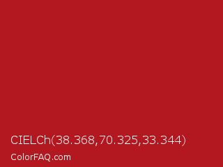 CIELCh 38.368,70.325,33.344 Color is a normal red color and the nearest color is Carnelian #b31b1b. Hex code #b3171f and RGB value is rgb(179,23,31). In RGB color space, this color is composed of 70% red, 9% green, 12% blue, In CMYK color space, this color is composed of 0% cyan, 87% magenta, 83% yellow , 30% black , In HSL color space, this color has a hue angle of 357° , 77% saturation and 40% lightness.