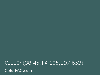 CIELCh 38.45,14.105,197.653 Color is a normal cyan color and the nearest color is William #3a686c. Hex code #3b6161 and RGB value is rgb(59,97,97). In RGB color space, this color is composed of 23% red, 38% green, 38% blue, In CMYK color space, this color is composed of 39% cyan, 0% magenta, 0% yellow , 62% black , In HSL color space, this color has a hue angle of 180° , 24% saturation and 31% lightness.