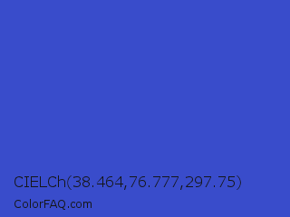 CIELCh 38.464,76.777,297.75 Color is a normal blue color and the nearest color is Cerulean Blue #2a52be. Hex code #394ccb and RGB value is rgb(57,76,203). In RGB color space, this color is composed of 22% red, 30% green, 80% blue, In CMYK color space, this color is composed of 72% cyan, 63% magenta, 0% yellow , 20% black , In HSL color space, this color has a hue angle of 232° , 58% saturation and 51% lightness.