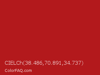 CIELCh 38.486,70.891,34.737 Color is a normal red color and the nearest color is Carnelian #b31b1b. Hex code #b3191c and RGB value is rgb(179,25,28). In RGB color space, this color is composed of 70% red, 10% green, 11% blue, In CMYK color space, this color is composed of 0% cyan, 86% magenta, 84% yellow , 30% black , In HSL color space, this color has a hue angle of 359° , 75% saturation and 40% lightness.