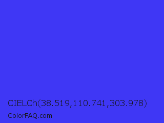 CIELCh 38.519,110.741,303.978 Color is a normal indigo color and the nearest color is Palatinate Blue #273be2. Hex code #3f37f5 and RGB value is rgb(63,55,245). In RGB color space, this color is composed of 25% red, 22% green, 96% blue, In CMYK color space, this color is composed of 74% cyan, 78% magenta, 0% yellow , 4% black , In HSL color space, this color has a hue angle of 243° , 90% saturation and 59% lightness.