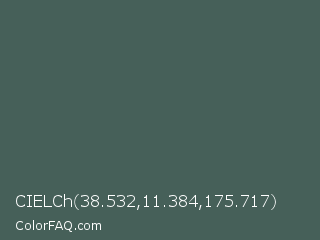 CIELCh 38.532,11.384,175.717 Color is a normal cyan color and the nearest color is Nandor #4b5d52. Hex code #466059 and RGB value is rgb(70,96,89). In RGB color space, this color is composed of 27% red, 38% green, 35% blue, In CMYK color space, this color is composed of 27% cyan, 0% magenta, 7% yellow , 62% black , In HSL color space, this color has a hue angle of 164° , 16% saturation and 33% lightness.