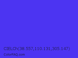 CIELCh 38.557,110.131,305.147 Color is a normal indigo color and the nearest color is Han Purple #5218fa. Hex code #4c34f2 and RGB value is rgb(76,52,242). In RGB color space, this color is composed of 30% red, 20% green, 95% blue, In CMYK color space, this color is composed of 69% cyan, 79% magenta, 0% yellow , 5% black , In HSL color space, this color has a hue angle of 248° , 88% saturation and 58% lightness.