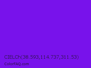 CIELCh 38.593,114.737,311.53 Color is a normal violet color and the nearest color is Violet Color Wheel #7f00ff. Hex code #7812eb and RGB value is rgb(120,18,235). In RGB color space, this color is composed of 47% red, 7% green, 92% blue, In CMYK color space, this color is composed of 49% cyan, 92% magenta, 0% yellow , 8% black , In HSL color space, this color has a hue angle of 268° , 86% saturation and 50% lightness.