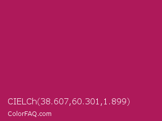 CIELCh 38.607,60.301,1.899 Color is a normal rose color and the nearest color is Jazzberry Jam #a50b5e. Hex code #ae195a and RGB value is rgb(174,25,90). In RGB color space, this color is composed of 68% red, 10% green, 35% blue, In CMYK color space, this color is composed of 0% cyan, 86% magenta, 48% yellow , 32% black , In HSL color space, this color has a hue angle of 334° , 75% saturation and 39% lightness.