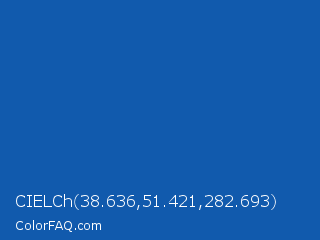 CIELCh 38.636,51.421,282.693 Color is a normal blue color and the nearest color is Fun Blue #1959a8. Hex code #115aad and RGB value is rgb(17,90,173). In RGB color space, this color is composed of 7% red, 35% green, 68% blue, In CMYK color space, this color is composed of 90% cyan, 48% magenta, 0% yellow , 32% black , In HSL color space, this color has a hue angle of 212° , 82% saturation and 37% lightness.