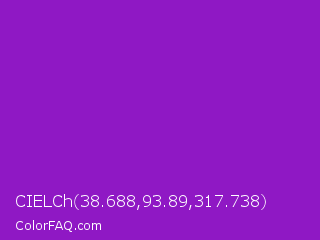 CIELCh 38.688,93.89,317.738 Color is a normal purple color and the nearest color is French Violet #8806ce. Hex code #8f18c4 and RGB value is rgb(143,24,196). In RGB color space, this color is composed of 56% red, 9% green, 77% blue, In CMYK color space, this color is composed of 27% cyan, 88% magenta, 0% yellow , 23% black , In HSL color space, this color has a hue angle of 282° , 78% saturation and 43% lightness.