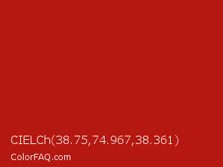 CIELCh 38.75,74.967,38.361 Color is a normal red color and the nearest color is International Orange Engineering #ba160c. Hex code #b51810 and RGB value is rgb(181,24,16). In RGB color space, this color is composed of 71% red, 9% green, 6% blue, In CMYK color space, this color is composed of 0% cyan, 87% magenta, 91% yellow , 29% black , In HSL color space, this color has a hue angle of 3° , 84% saturation and 39% lightness.