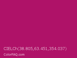 CIELCh 38.805,63.451,354.037 Color is a normal magenta color and the nearest color is Lipstick #ab0563. Hex code #af1268 and RGB value is rgb(175,18,104). In RGB color space, this color is composed of 69% red, 7% green, 41% blue, In CMYK color space, this color is composed of 0% cyan, 90% magenta, 41% yellow , 31% black , In HSL color space, this color has a hue angle of 327° , 81% saturation and 38% lightness.