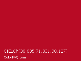 CIELCh 38.835,71.831,30.127 Color is a normal red color and the nearest color is Shiraz #b20931. Hex code #b80b25 and RGB value is rgb(184,11,37). In RGB color space, this color is composed of 72% red, 4% green, 15% blue, In CMYK color space, this color is composed of 0% cyan, 94% magenta, 80% yellow , 28% black , In HSL color space, this color has a hue angle of 351° , 89% saturation and 38% lightness.