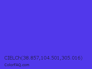 CIELCh 38.857,104.501,305.016 Color is a normal indigo color and the nearest color is Majorelle Blue #6050dc. Hex code #5138eb and RGB value is rgb(81,56,235). In RGB color space, this color is composed of 32% red, 22% green, 92% blue, In CMYK color space, this color is composed of 66% cyan, 76% magenta, 0% yellow , 8% black , In HSL color space, this color has a hue angle of 248° , 82% saturation and 57% lightness.