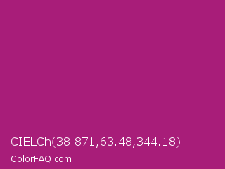 CIELCh 38.871,63.48,344.18 Color is a normal magenta color and the nearest color is Amaranth Deep Purple #9f2b68. Hex code #a81d79 and RGB value is rgb(168,29,121). In RGB color space, this color is composed of 66% red, 11% green, 47% blue, In CMYK color space, this color is composed of 0% cyan, 83% magenta, 28% yellow , 34% black , In HSL color space, this color has a hue angle of 320° , 71% saturation and 39% lightness.