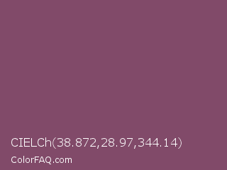 CIELCh 38.872,28.97,344.14 Color is a normal magenta color and the nearest color is Twilight Lavender #8a496b. Hex code #814a69 and RGB value is rgb(129,74,105). In RGB color space, this color is composed of 51% red, 29% green, 41% blue, In CMYK color space, this color is composed of 0% cyan, 43% magenta, 19% yellow , 49% black , In HSL color space, this color has a hue angle of 326° , 27% saturation and 40% lightness.