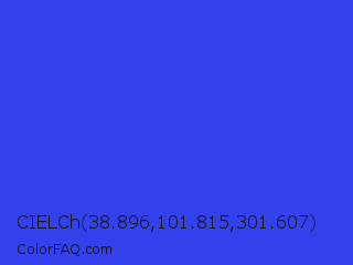 CIELCh 38.896,101.815,301.607 Color is a normal blue color and the nearest color is Palatinate Blue #273be2. Hex code #3341ed and RGB value is rgb(51,65,237). In RGB color space, this color is composed of 20% red, 25% green, 93% blue, In CMYK color space, this color is composed of 78% cyan, 73% magenta, 0% yellow , 7% black , In HSL color space, this color has a hue angle of 235° , 84% saturation and 56% lightness.