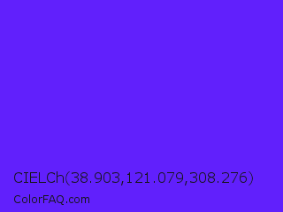 CIELCh 38.903,121.079,308.276 Color is a normal indigo color and the nearest color is Han Purple #5218fa. Hex code #6120fc and RGB value is rgb(97,32,252). In RGB color space, this color is composed of 38% red, 13% green, 99% blue, In CMYK color space, this color is composed of 62% cyan, 87% magenta, 0% yellow , 1% black , In HSL color space, this color has a hue angle of 258° , 97% saturation and 56% lightness.