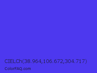 CIELCh 38.964,106.672,304.717 Color is a normal indigo color and the nearest color is Han Purple #5218fa. Hex code #4d38ef and RGB value is rgb(77,56,239). In RGB color space, this color is composed of 30% red, 22% green, 94% blue, In CMYK color space, this color is composed of 68% cyan, 77% magenta, 0% yellow , 6% black , In HSL color space, this color has a hue angle of 247° , 85% saturation and 58% lightness.