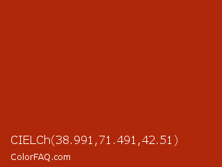 CIELCh 38.991,71.491,42.51 Color is a normal red color and the nearest color is Rufous #a81c07. Hex code #af280a and RGB value is rgb(175,40,10). In RGB color space, this color is composed of 69% red, 16% green, 4% blue, In CMYK color space, this color is composed of 0% cyan, 77% magenta, 94% yellow , 31% black , In HSL color space, this color has a hue angle of 11° , 89% saturation and 36% lightness.