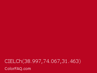 CIELCh 38.997,74.067,31.463 Color is a normal red color and the nearest color is Monza #c7031e. Hex code #ba0521 and RGB value is rgb(186,5,33). In RGB color space, this color is composed of 73% red, 2% green, 13% blue, In CMYK color space, this color is composed of 0% cyan, 97% magenta, 82% yellow , 27% black , In HSL color space, this color has a hue angle of 351° , 95% saturation and 37% lightness.