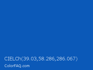 CIELCh 39.03,58.286,286.067 Color is a normal blue color and the nearest color is Sapphire #0f52ba. Hex code #0b59b8 and RGB value is rgb(11,89,184). In RGB color space, this color is composed of 4% red, 35% green, 72% blue, In CMYK color space, this color is composed of 94% cyan, 52% magenta, 0% yellow , 28% black , In HSL color space, this color has a hue angle of 213° , 89% saturation and 38% lightness.