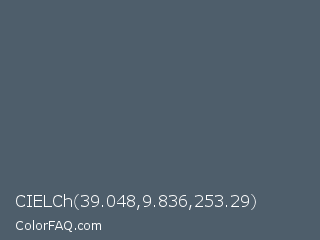 CIELCh 39.048,9.836,253.29 Color is a normal blue color and the nearest color is Deep Space Sparkle #4a646c. Hex code #4e5e6b and RGB value is rgb(78,94,107). In RGB color space, this color is composed of 31% red, 37% green, 42% blue, In CMYK color space, this color is composed of 27% cyan, 12% magenta, 0% yellow , 58% black , In HSL color space, this color has a hue angle of 207° , 16% saturation and 36% lightness.