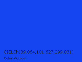 CIELCh 39.064,101.627,299.831 Color is a normal blue color and the nearest color is Blue RYB #0247fe. Hex code #1445f0 and RGB value is rgb(20,69,240). In RGB color space, this color is composed of 8% red, 27% green, 94% blue, In CMYK color space, this color is composed of 92% cyan, 71% magenta, 0% yellow , 6% black , In HSL color space, this color has a hue angle of 227° , 88% saturation and 51% lightness.