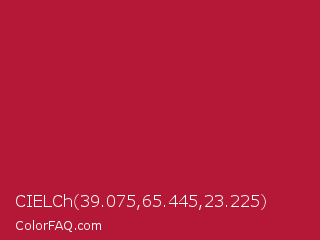 CIELCh 39.075,65.445,23.225 Color is a normal red color and the nearest color is Shiraz #b20931. Hex code #b51736 and RGB value is rgb(181,23,54). In RGB color space, this color is composed of 71% red, 9% green, 21% blue, In CMYK color space, this color is composed of 0% cyan, 87% magenta, 70% yellow , 29% black , In HSL color space, this color has a hue angle of 348° , 77% saturation and 40% lightness.