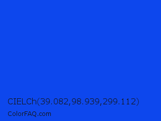 CIELCh 39.082,98.939,299.112 Color is a normal blue color and the nearest color is Blue RYB #0247fe. Hex code #0d47ed and RGB value is rgb(13,71,237). In RGB color space, this color is composed of 5% red, 28% green, 93% blue, In CMYK color space, this color is composed of 95% cyan, 70% magenta, 0% yellow , 7% black , In HSL color space, this color has a hue angle of 224° , 90% saturation and 49% lightness.