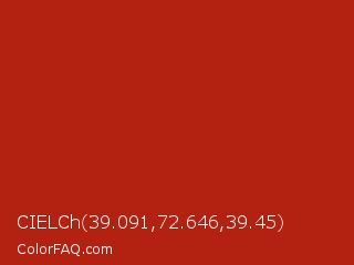 CIELCh 39.091,72.646,39.45 Color is a normal red color and the nearest color is Carnelian #b31b1b. Hex code #b32111 and RGB value is rgb(179,33,17). In RGB color space, this color is composed of 70% red, 13% green, 7% blue, In CMYK color space, this color is composed of 0% cyan, 82% magenta, 91% yellow , 30% black , In HSL color space, this color has a hue angle of 6° , 83% saturation and 38% lightness.