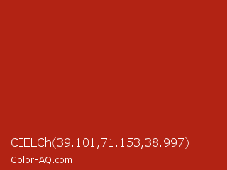 CIELCh 39.101,71.153,38.997 Color is a normal red color and the nearest color is Carnelian #b31b1b. Hex code #b22314 and RGB value is rgb(178,35,20). In RGB color space, this color is composed of 70% red, 14% green, 8% blue, In CMYK color space, this color is composed of 0% cyan, 80% magenta, 89% yellow , 30% black , In HSL color space, this color has a hue angle of 6° , 80% saturation and 39% lightness.