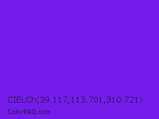 CIELCh 39.117,113.701,310.721 Color is a normal violet color and the nearest color is Blue Violet #8a2be2. Hex code #751ced and RGB value is rgb(117,28,237). In RGB color space, this color is composed of 46% red, 11% green, 93% blue, In CMYK color space, this color is composed of 51% cyan, 88% magenta, 0% yellow , 7% black , In HSL color space, this color has a hue angle of 266° , 85% saturation and 52% lightness.