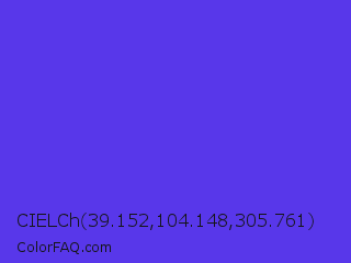 CIELCh 39.152,104.148,305.761 Color is a normal indigo color and the nearest color is Majorelle Blue #6050dc. Hex code #5837ea and RGB value is rgb(88,55,234). In RGB color space, this color is composed of 35% red, 22% green, 92% blue, In CMYK color space, this color is composed of 62% cyan, 76% magenta, 0% yellow , 8% black , In HSL color space, this color has a hue angle of 251° , 81% saturation and 57% lightness.