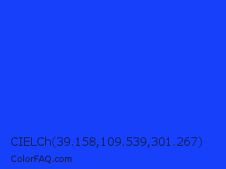CIELCh 39.158,109.539,301.267 Color is a normal blue color and the nearest color is Blue RYB #0247fe. Hex code #1740fa and RGB value is rgb(23,64,250). In RGB color space, this color is composed of 9% red, 25% green, 98% blue, In CMYK color space, this color is composed of 91% cyan, 74% magenta, 0% yellow , 2% black , In HSL color space, this color has a hue angle of 229° , 96% saturation and 54% lightness.
